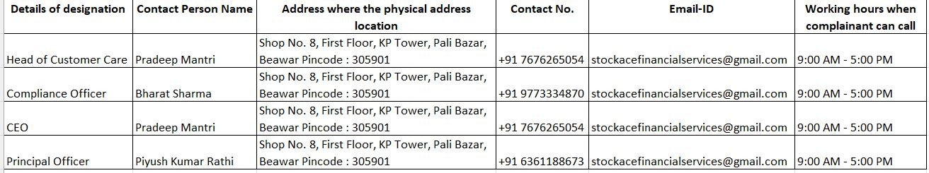 In case your any grievance you can send an email at the following mailing address or call us at the number given below Email us: stockacefinancialservices@gmail.com Call us: +91-7676265054